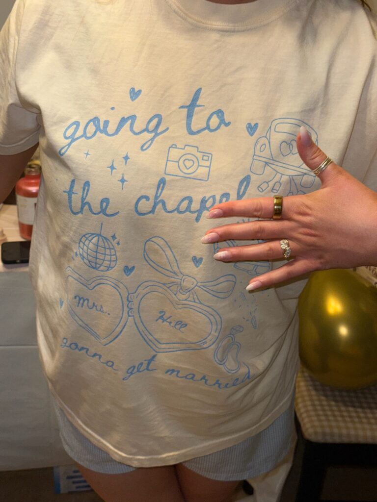 A custom “Future Mrs. Hill” t-shirt with little wedding icons – I wore it the night of our engagement and it was adorable.