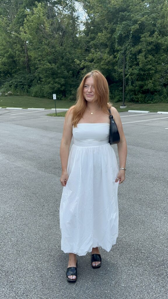 We toured in late summer, which meant warm weather… and one venue that was literally a construction site (IYKYK). So my outfit may not have been the most practical, but it was definitely summer-pretty! I wore a long midi, strapless white dress with a bubble hem. I couldn’t find the exact link on their website anymore, but the dress is called the Altar’d State Luca Midi Dress (NWT).
