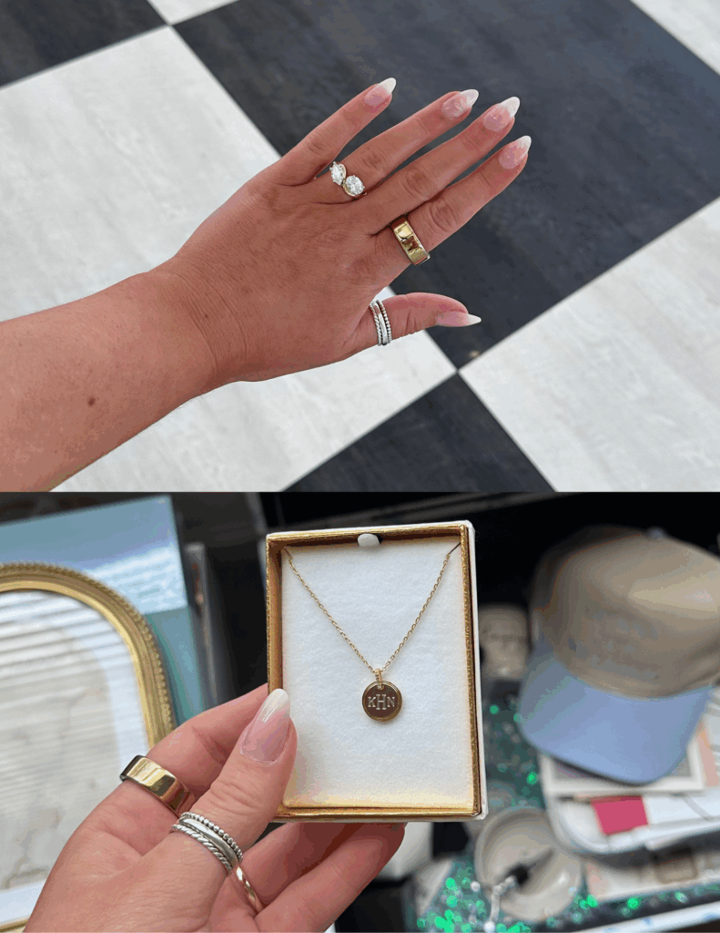 My best friend also gifted me a dainty gold necklace with my future initials monogrammed on it (from the same jeweler who made my ring!), and I wear literally it every day!
